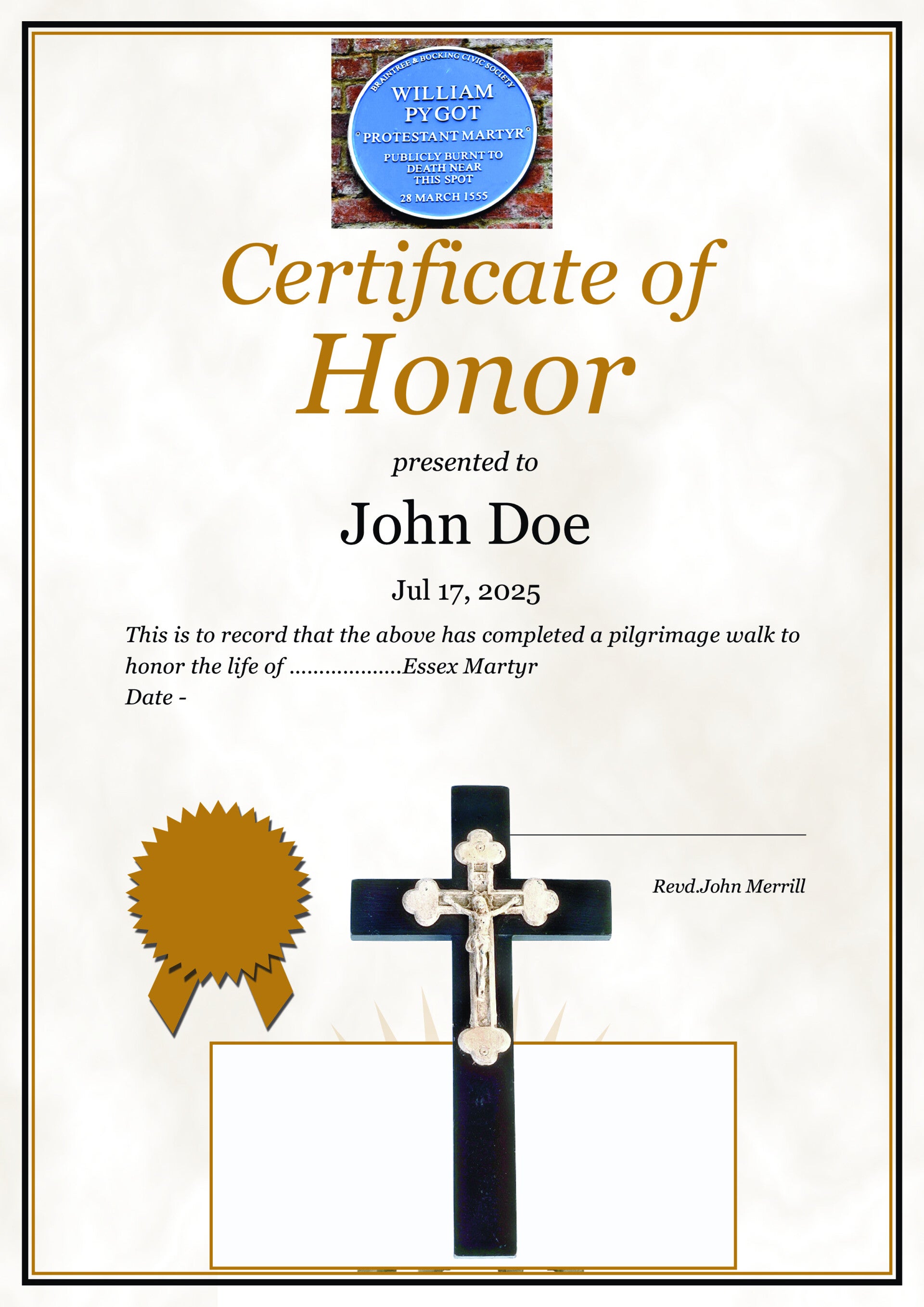 Special Martyr certificate available from John Merrill.